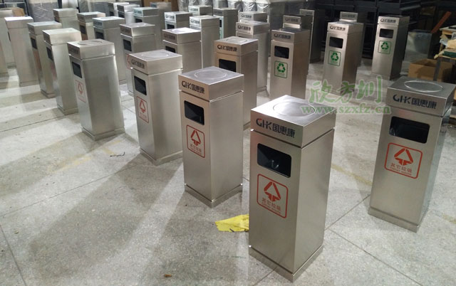 這批投放深圳石巖的C516商場不銹鋼垃圾桶尺寸規(guī)格為300*300*870mm,采用1.0mm厚的優(yōu)質(zhì)201不銹鋼板材經(jīng)激光切割剪板下料,數(shù)控折彎各部件,由多年經(jīng)驗的鈑金師傅焊接焊點平滑美觀,打磨拋光等鈑金工藝制作而成。深圳石巖商場室內(nèi)不銹鋼垃圾桶邊角圓弧設(shè)計有效防止顧客撞擊,表面打磨拋光在使用過程中不傷手。桶頂部分翻蓋投口設(shè)計,桶身開口垃圾投放,垃圾多方位投放更便捷,絲印商場標識及垃圾分類標識。