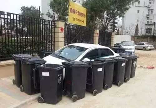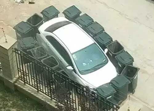 垃圾桶不用來(lái)裝垃圾,卻被拿來(lái)“圍堵綁架”小轎車