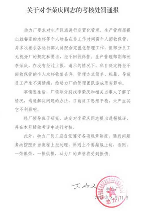 動(dòng)力廠一名工作人員提供的一份《關(guān)于對(duì)李榮慶同志的考核處罰通報(bào)》顯示,該廠生產(chǎn)管理部提出就餐室的水杯等個(gè)人物品在非工作時(shí)間由個(gè)人回收保管,但部分員工無視此規(guī)定和要求,拒不回收保管。李榮慶在沒有經(jīng)過上報(bào)請(qǐng)示的情況下,私自決定將拒不回收保管的個(gè)人水杯收集丟棄,管理方式簡(jiǎn)單粗暴,導(dǎo)致員工產(chǎn)生不滿情緒,給動(dòng)力廠的管理團(tuán)隊(duì)造成惡劣影響。