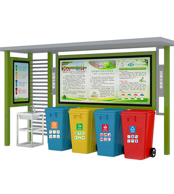 設(shè)有擋雨棚,可配備垃圾箱信息顯示屏、防水照明燈、廣告屏,進(jìn)行地面硬化。對(duì)社區(qū)玻金塑紙可回收物,其他垃圾,廚余垃圾,有害垃圾等生活垃圾定時(shí)定點(diǎn)投放收集.